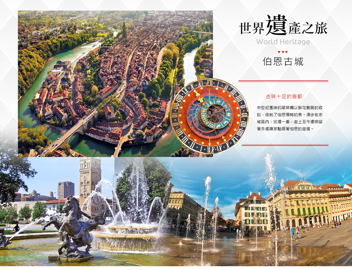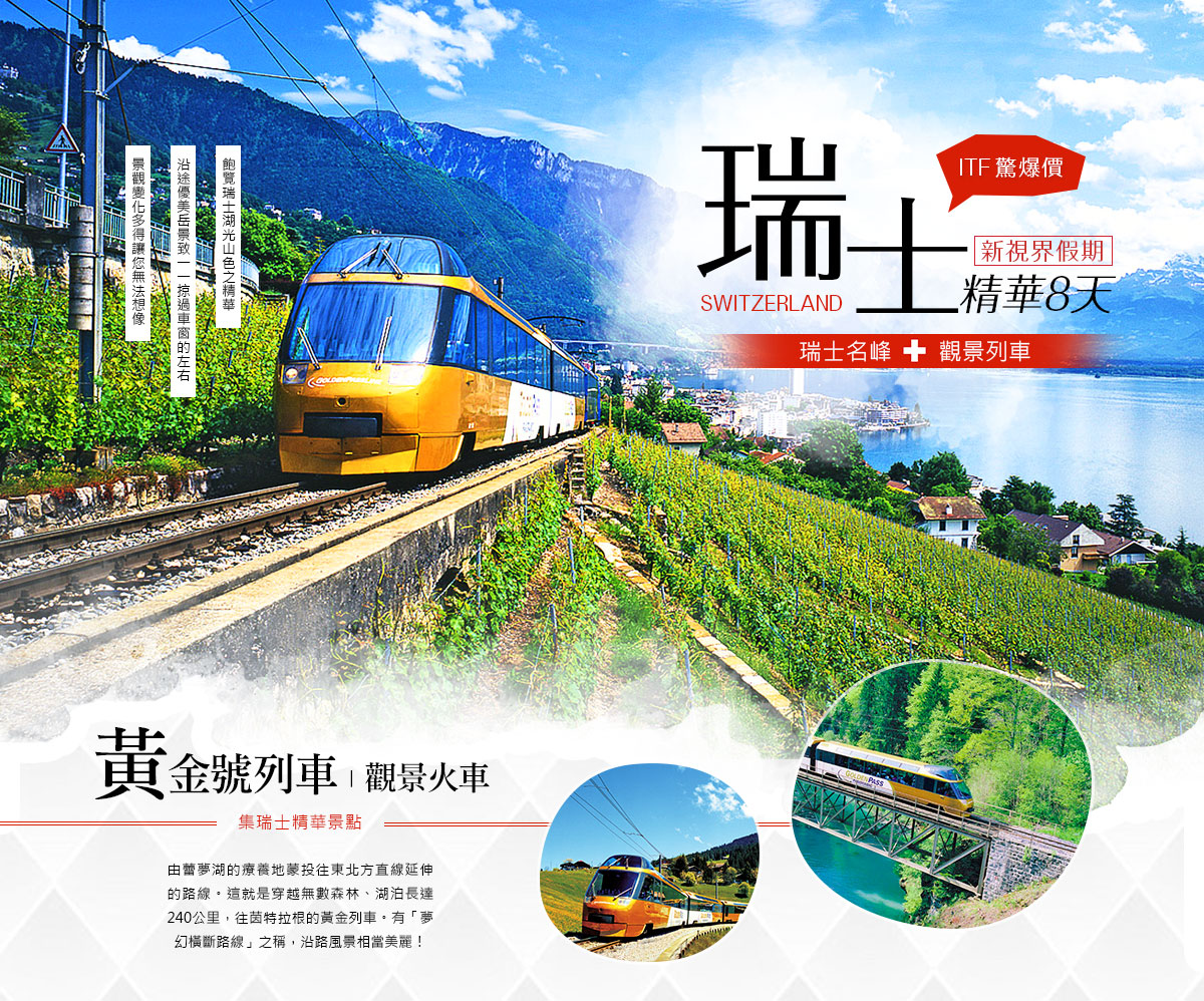 ★少女峰之旅(世界自然遺產)-有著歐洲屋脊之美稱(體驗阿爾卑斯山的冰河世界)。也於2001年被聯合國教科文組織評選為世界文化遺產之一;且少女峰鐵道公司因應2012年百年紀念新增全新設施“阿爾卑斯的震撼”先由360度的壯麗震撼影音開場,接續體驗各種不同燈光效果伴隨音樂沿著輸送道循序參觀生動的少女峰鐵道建造史以及當地旅遊發展。