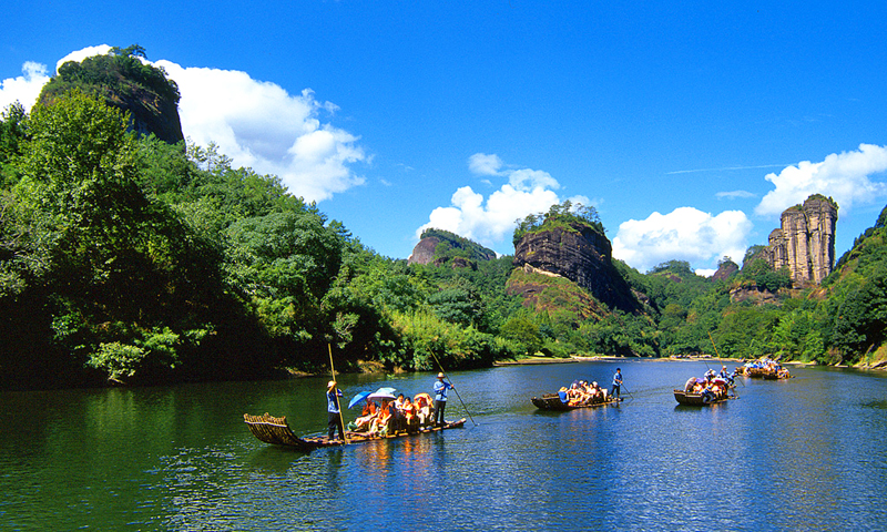 【武夷山】武夷山位於福建省北部,素以獨特的『碧水丹山』聞名遐邇,人稱「三十六峰真 奇絕,一溪九曲碧漣漪;白雲遮眼不知處,人間仙境在武夷」,它兼有黃山之奇、桂林之秀、泰岱之 雄、華岳之險、西湖之美。於1999年12月武夷山正式列入世界自然與文化遺產名錄。