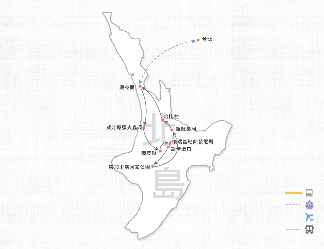 ■【參考行車距離】奧克蘭—192KM (3HRS)—懷托摩—150KM(2HRS)—陶波湖區